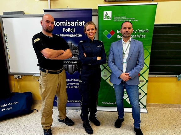 Policjantka z Komisariatu Policji w Nowogardzie, przedstawiciel Kasy Rolniczego Ubezpieczenia Społecznego oraz reprezentant Fundacji Wsparcia Społecznego „Razem Bezpieczniej” przeprowadzili zajęcia edukacyjne dla uczniów Szkoły Podstawowej nr 4 w Nowogardzie oraz Szkoły Podstawowej w Orzechowie. Podczas spotkania omówiono zasady bezpieczeństwa, ruchu drogowego, udzielania pierwszej pomocy oraz znaczenie widoczności na drodze. Każdy uczeń otrzymał także element odblaskowy, aby zwiększyć swoją widoczność na drodze.