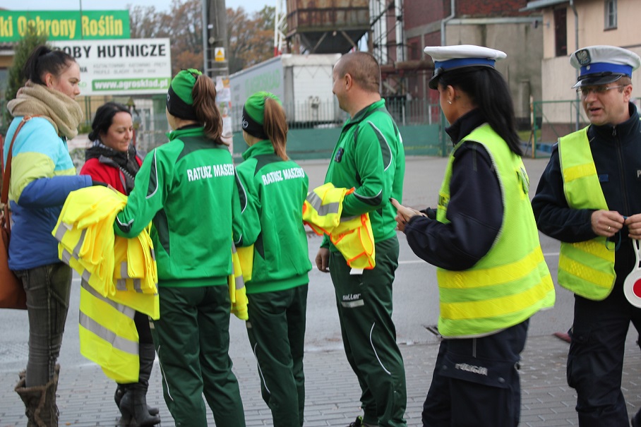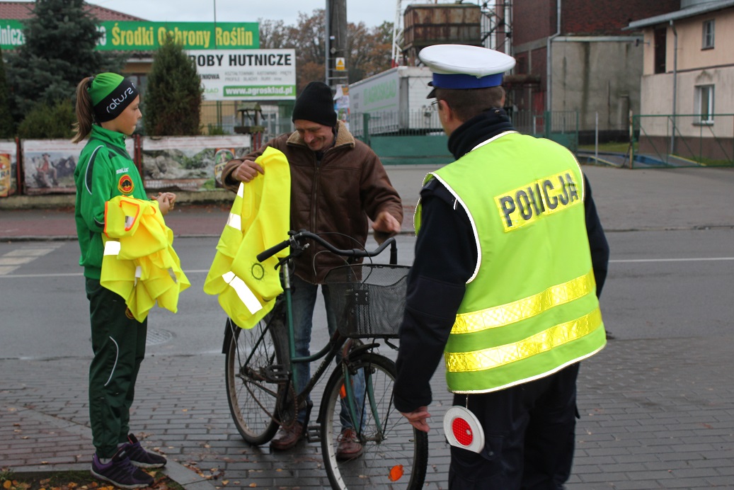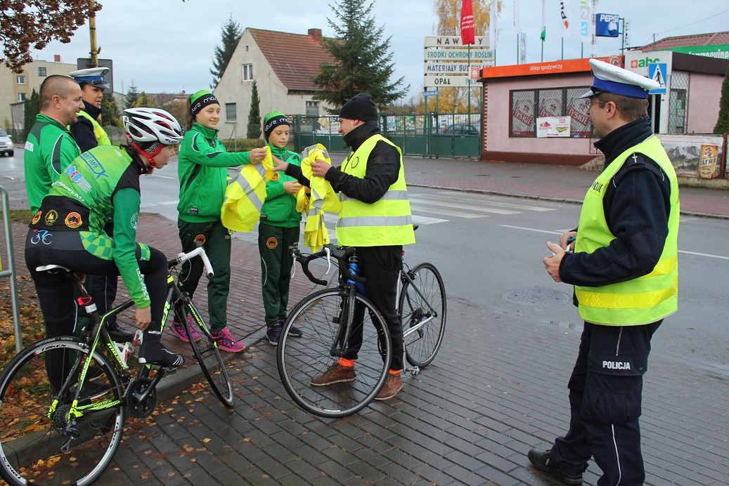 Policjanci ruchu drogowego z Goleniowa wspólnie z zawodnikami sekcji kolarskiej Uczniowskiego Klubu Sportowego „Ratusz Maszewo”, dbając o bezpieczeństwo niechronionych użytkowników dróg, rozdawali pieszym i rowerzystom kamizelki odblaskowe oraz przypominali o przepisach dotyczących ich stosowania.