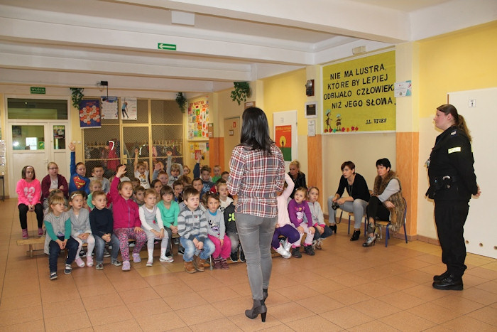 Jednym z tematów spotkania z najmłodszymi była bezpieczna droga do i ze szkoły oraz propagowanie właściwych zachowań, które mają wpływ na bezpieczeństwo dzieci w życiu codziennym. Uczniowie dowiedzieli się również, jak ważne jest noszenie elementów odblaskowych.