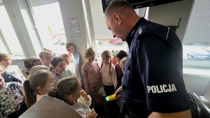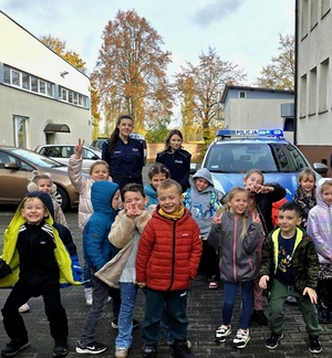 Kolejnym punktem wizyty było spotkanie z Komendantem Powiatowym Policji w Goleniowie mł. insp. Sławomirem Daszkiewiczem, który serdecznie przywitał najmłodszych gości. Komendant z uśmiechem odpowiadał na ich liczne pytania, a następnie wręczył każdemu dziecku odblask, przypominając, jak ważne jest bycie widocznym na drodze – zwłaszcza w jesienne, szybko zapadające wieczory. Dzieci dowiedziały się również, gdzie najlepiej nosić odblaski, by spełniały swoją rolę i chroniły pieszych.