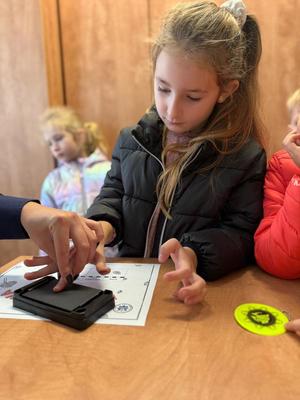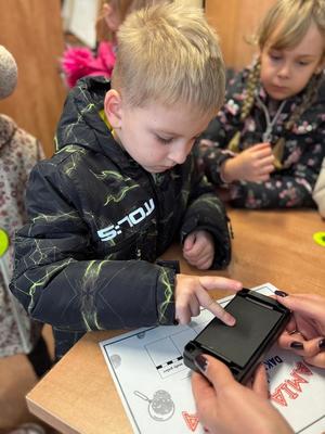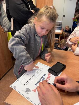 Na zakończenie wizyty przedszkolaki mogły poznać tajemnicę swoich odcisków palców – każde dziecko odcisnęło palec na kartce i przekonało się, że każdy człowiek ma unikalny wzór linii papilarnych. Ten element spotkania wzbudził ogromne zainteresowanie i wywołał wiele uśmiechów.