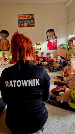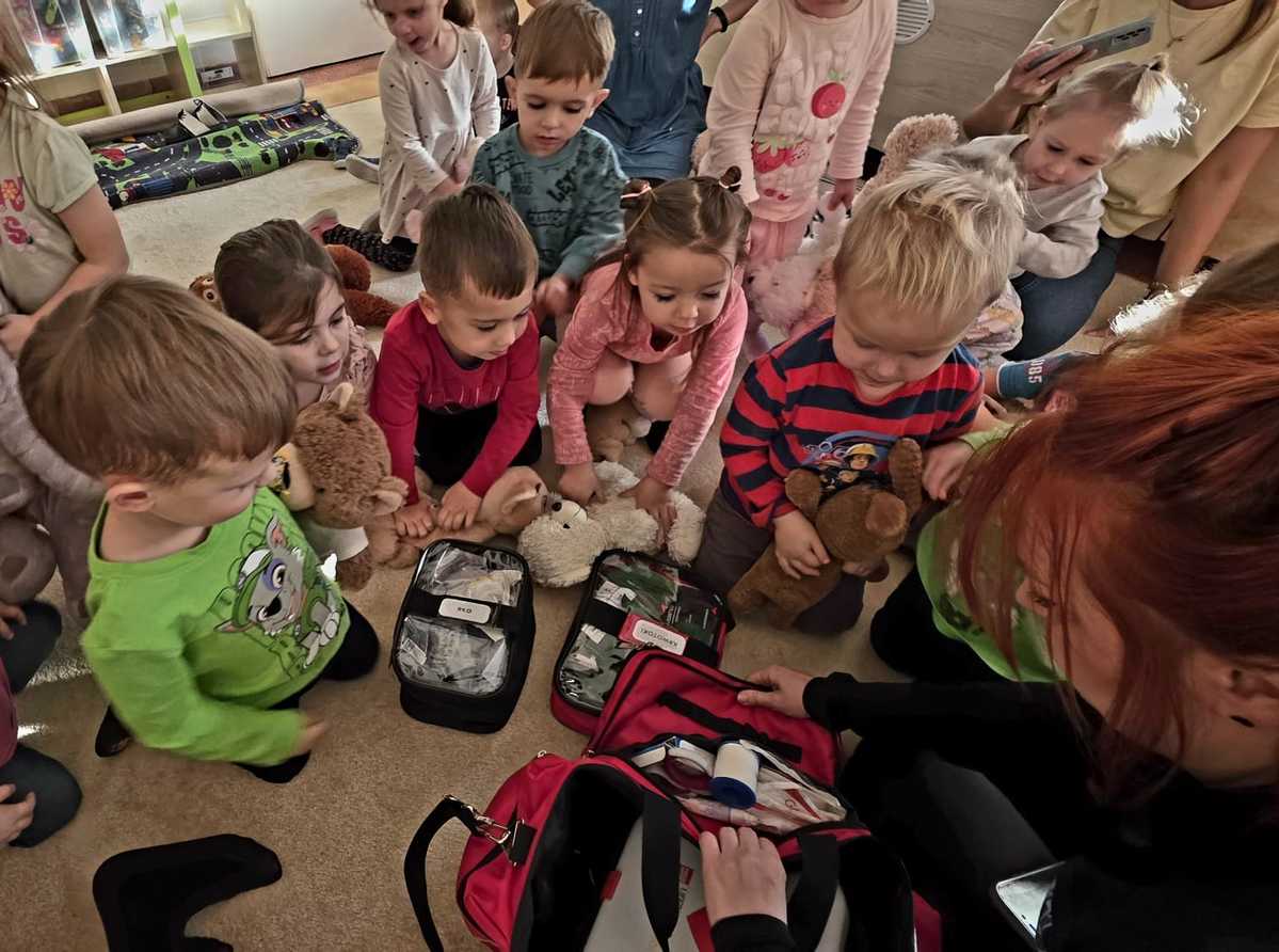 Ratownicy z Fundacji uRATUJsie przygotowali dla młodszej grupy praktyczny pokaz podstawowego wyposażenia apteczki. Dzieci mogły zobaczyć m.in. różnego rodzaju opatrunki, gazy, plastry czy maseczki ochronne. Największą atrakcją okazało się jednak opatrywanie… pluszowych misiów. Każde dziecko mogło przykleić plasterek, założyć opatrunek i „uleczyć” swojego ulubionego pluszaka, ucząc się przy tym, jak wygląda dbanie o niewielkie urazy.