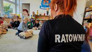 Drugie spotkanie, skierowane do starszych dzieci, miało charakter jeszcze bardziej praktyczny. Przedszkolaki uczyły się udzielania pierwszej pomocy na fantomie. Każdy miał okazję wykonać 30 uciśnięć klatki piersiowej, poznać właściwą postawę i zrozumieć, jak ważny jest rytm oraz siła ucisków. Dzieci nie tylko ćwiczyły z ogromnym zaangażowaniem, ale także zadawały wiele trafnych pytań, pokazując, jak dużo już wiedzą. Następnie ratownicy omówili temat zadławień. Wyjaśnili, po czym je rozpoznać i jak krok po kroku działać w takiej sytuacji. Dzięki specjalnej kamizelce treningowej przedszkolaki mogły bezpiecznie poćwiczyć wykonywanie odpowiednich manewrów, ucząc się prawidłowych reakcji ratujących życie.