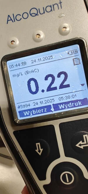 - Około godziny 5:00 zatrzymano 39-letniego kierującego Oplem. Badanie wykazało 0,23 mg/l alkoholu w wydychanym powietrzu (ok. 0,48 promila). Mężczyzna prowadził pojazd pomimo aktywnego zakazu oraz cofniętych uprawnień. Grozi mu kara do 5 lat pozbawienia wolności.