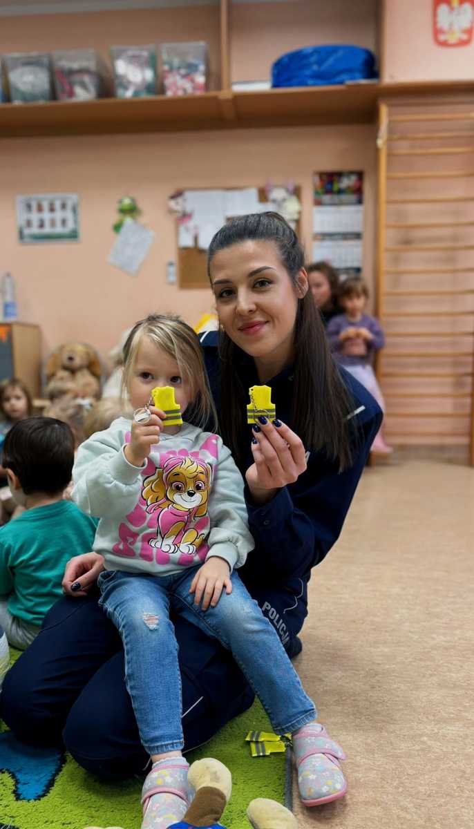 Spotkanie przebiegało w atmosferze ciekawości i zaangażowania. Policjanci wspólnie z dziećmi omówili najważniejsze zasady bezpieczeństwa, przypomnieli, jak prawidłowo korzystać z numeru alarmowego 112 oraz jakie informacje należy przekazać operatorowi. Podkreślono również, jak ważne jest zachowanie spokoju i szybkie wezwanie pomocy w sytuacjach kryzysowych. Dodatkową atrakcją była możliwość wykonania odcisku palca – dzieci mogły przekonać się, że każdy człowiek ma unikalne linie papilarne, które czynią nas wyjątkowymi. Policjanci przypomnieli również, jak ważne są odblaski i jak pomagają w bezpiecznym poruszaniu się po zmroku. Każde dziecko otrzymało własny odblask, aby mogło być lepiej widoczne na drodze.