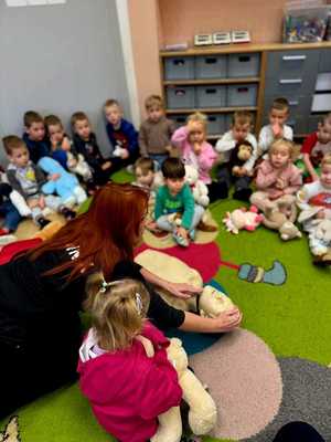Ratownicy z Fundacji uRATUJsie przygotowali pokaz wyposażenia apteczki. Dzieci mogły zobaczyć różne opatrunki, plastry czy maseczki ochronne, a największą atrakcją okazało się opatrywanie pluszowych misiów – każdy przedszkolak miał okazję „uleczyć” swojego ulubionego pluszaka, ucząc się przy tym, jak wygląda dbanie o drobne urazy. Nie zabrakło także praktycznych ćwiczeń na fantomie – dzieci wykonywały uciśnięcia klatki piersiowej, poznając właściwą technikę i rytm. Ich zaangażowanie i trafne pytania pokazały, że już w tak młodym wieku potrafią zrozumieć wagę pierwszej pomocy.