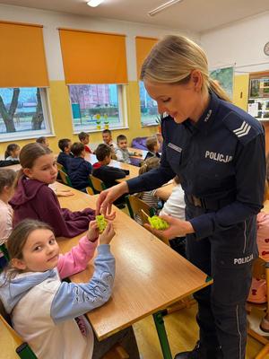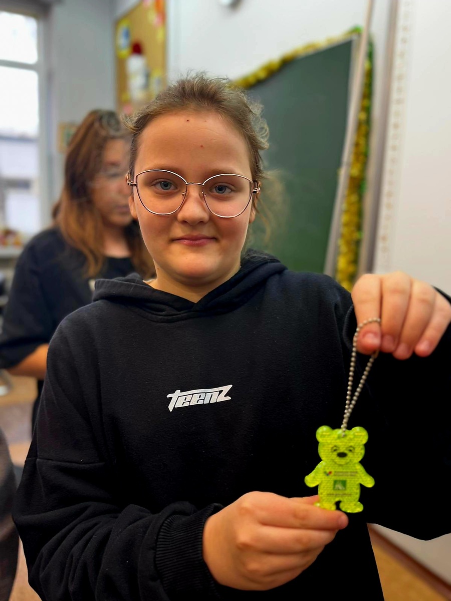 Nie zabrakło także rozmów na temat widoczności na drodze – szczególnie ważnej o tej porze roku, gdy zmrok zapada znacznie szybciej. Podkreślano, jak ważne jest noszenie elementów odblaskowych i jak bardzo mogą one zwiększyć bezpieczeństwo pieszego. Każdy z uczniów otrzymał od przedstawiciela KRUS odblask, który ma pomagać w byciu widocznym w drodze do szkoły i domu.