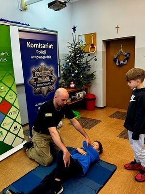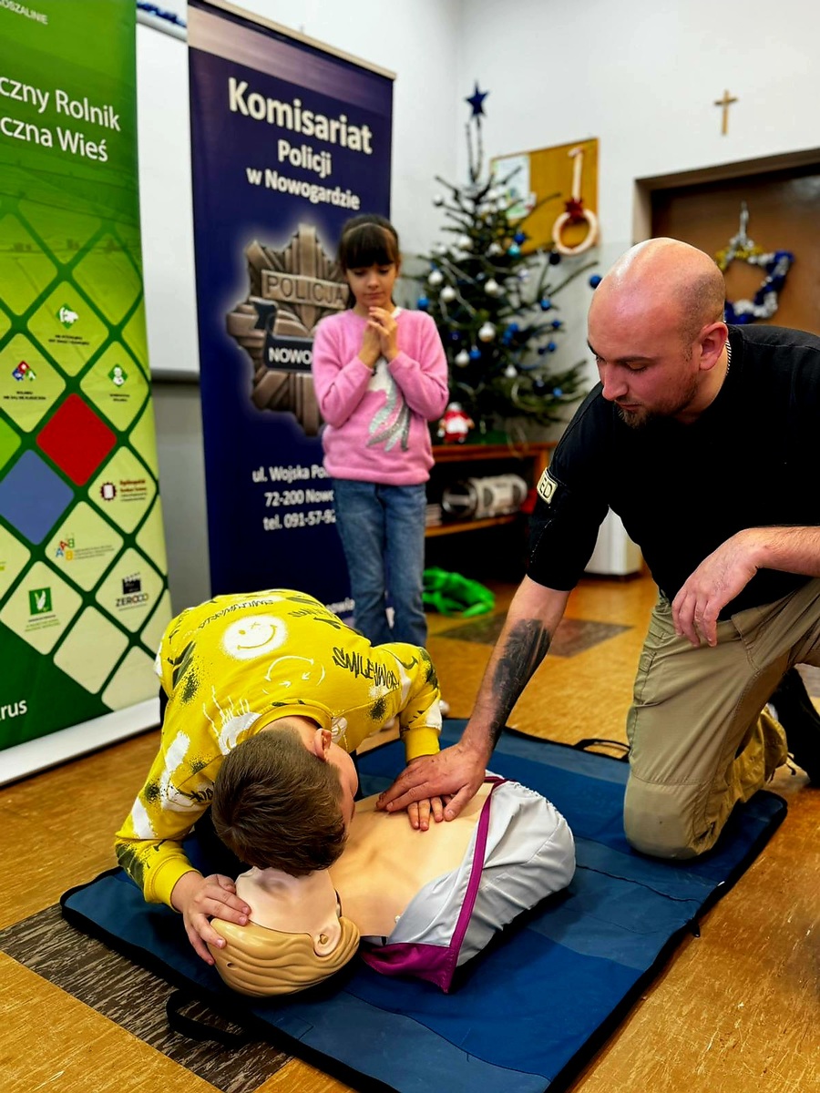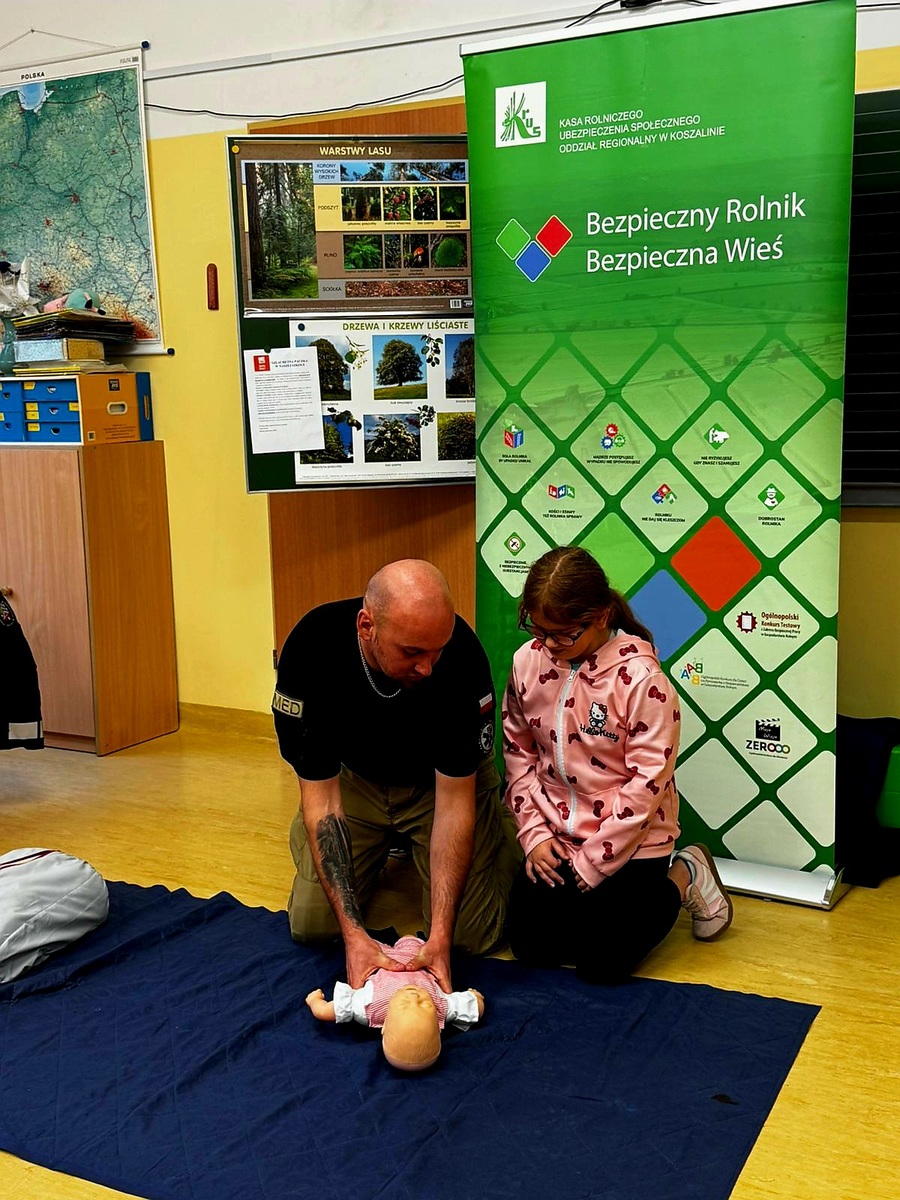 Szczególnym zainteresowaniem uczniów cieszył się blok poświęcony pierwszej pomocy. Podczas zajęć najmłodsi poznali podstawowe zasady postępowania w nagłych wypadkach, dowiedzieli się, jak prawidłowo ocenić stan osoby poszkodowanej oraz kiedy należy wezwać służby ratunkowe. Dzięki wykorzystaniu fantomu uczniowie mogli praktycznie przećwiczyć uciski klatki piersiowej, co wywołało duże zaangażowanie i ciekawość.