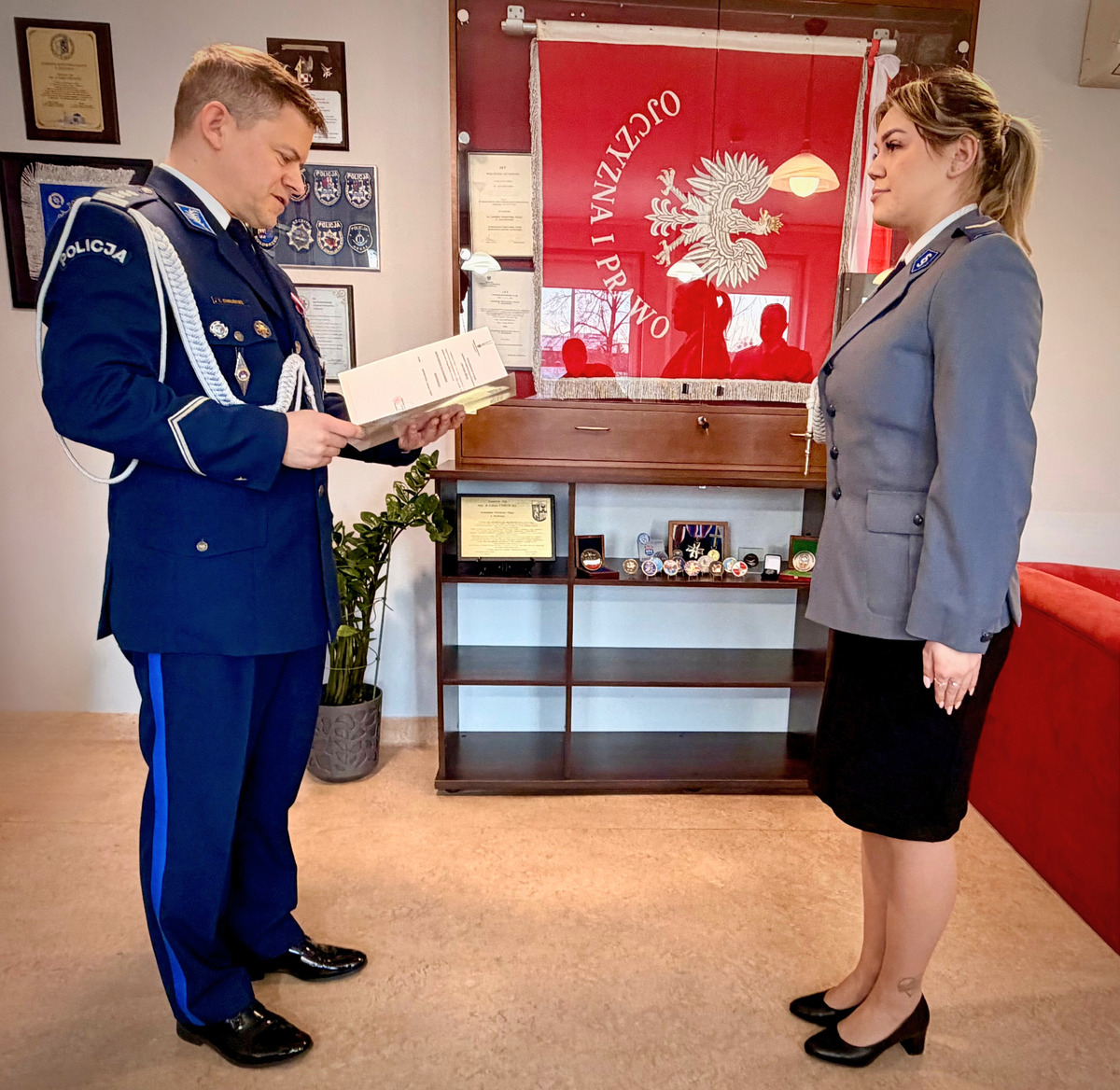 Dzisiaj w Komendzie Powiatowej Policji w Goleniowie Komendant Powiatowy Policji w Goleniowie insp. dr Łukasz Chruściel wręczył akt mianowania na wyższy stopień służbowy sierż. Roksanie Russ, która pełni służbę w Wydziale do Walki z Korupcją i Przestępczością Gospodarczą. W uroczystości uczestniczyli p.o. I Zastępcy Komendanta Powiatowego Policji w Goleniowie kom. Sławomir Smolarczyk oraz Naczelnik Wydziału do Walki z Korupcją i Przestępczością Gospodarczą podkom. Rafał Klimczak.