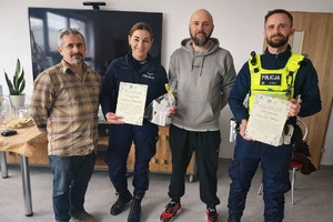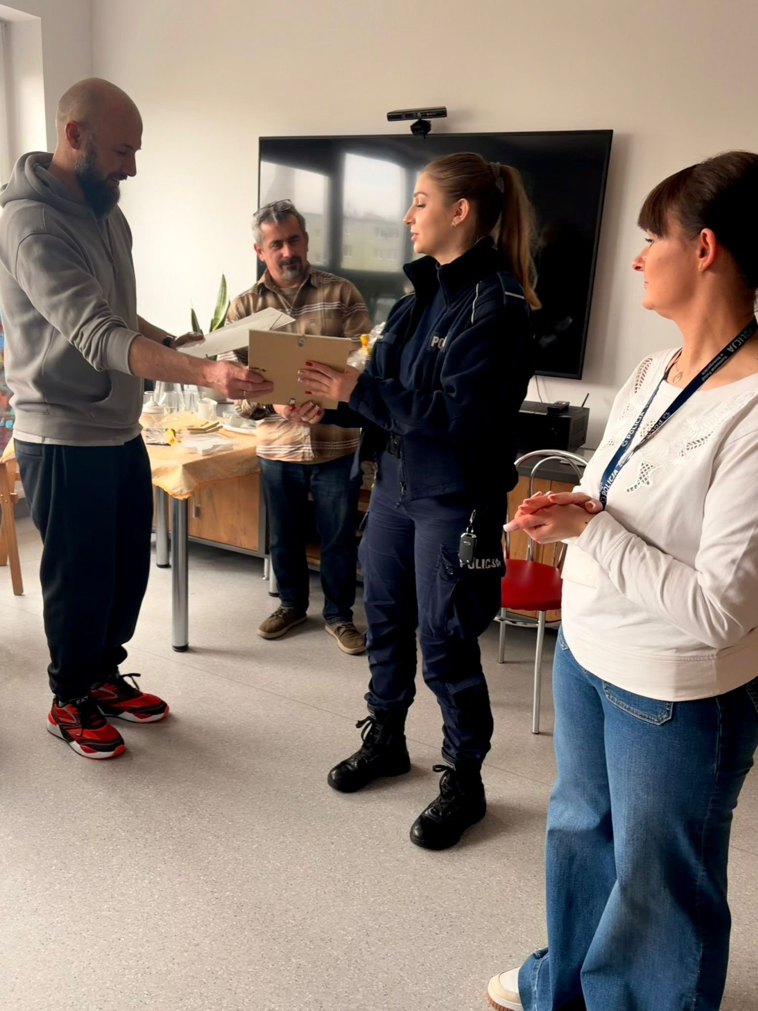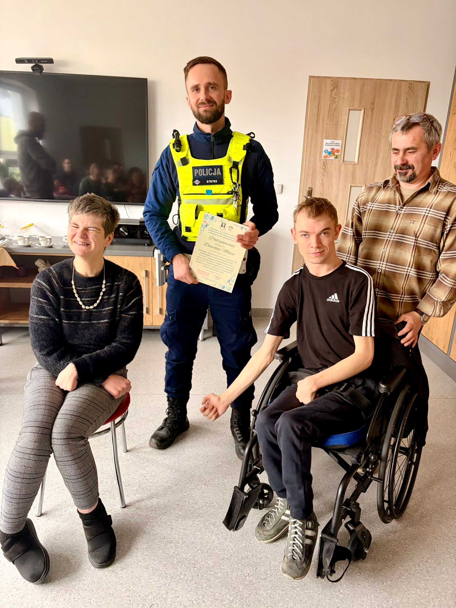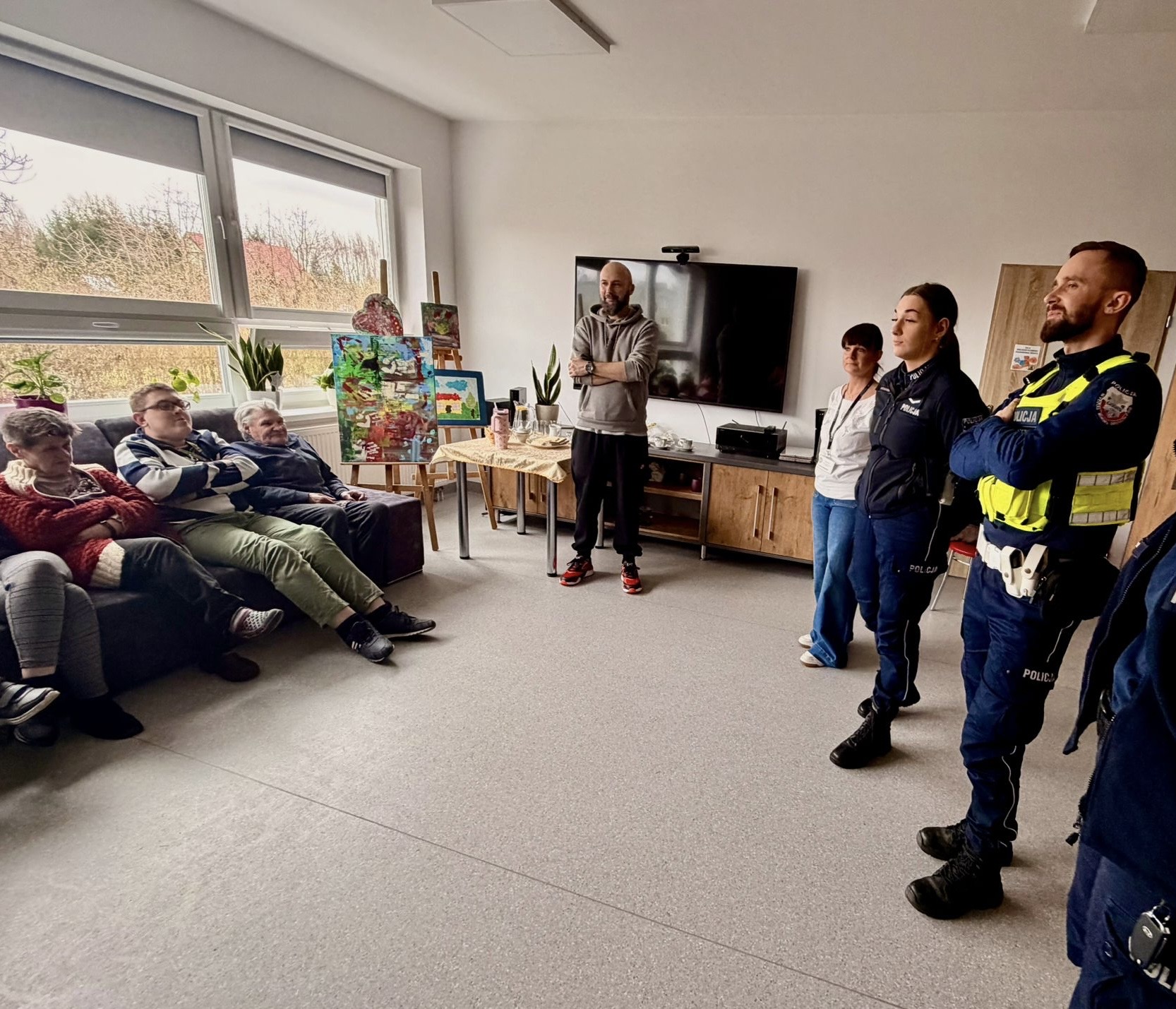 Funkcjonariusze KPP w Goleniowie mieli przyjemność przeprowadzić spotkanie w Środowiskowym Domu Samopomocy w Przybiernowie, podczas którego omówili najważniejsze zagadnienia związane z bezpieczeństwem - zarówno na drodze, jak i w sieci. Wydarzenie przebiegło w miłej, serdecznej atmosferze, pełnej uśmiechów, ciekawych pytań i wspólnej rozmowy o tym, jak dbać o swoje bezpieczeństwo na co dzień.