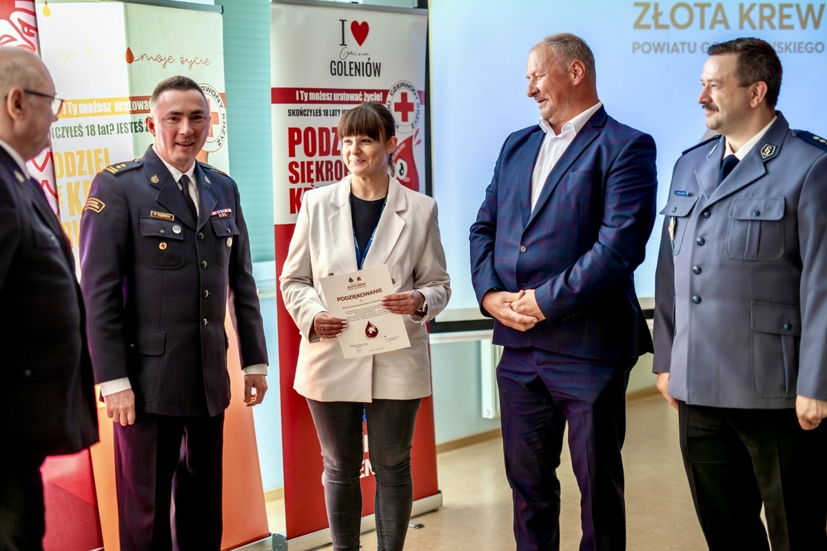 Uroczysta gala „ZŁOTA KREW” powiatu goleniowskiego została zorganizowana przez Komendanta Powiatowego Państwowej Straży Pożarnej w Goleniowie bryg. mgr inż. Piotra Tuzimka przy udziale Prezesa Klubu Honorowych Dawców Krwi PCK „Strażak” przy KP PSP w Goleniowie Ryszarda Sikory. Spotkanie odbyło się w budynku Komendy Powiatowej PSP w Goleniowie i zgromadziło liczne grono przedstawicieli służb, instytucji oraz samorządów, którzy aktywnie wspierają rozwój honorowego krwiodawstwa w powiecie goleniowskim. Wśród zaproszonych gości znaleźli się m.in. Zastępca Zachodniopomorskiego Komendanta Wojewódzkiego PSP bryg. Marek Michalak, przedstawiciele Zachodniopomorskiego Oddziału Okręgowego Polskiego Czerwonego Krzyża w Szczecinie, Regionalnego Centrum Krwiodawstwa i Krwiolecznictwa w Szczecinie, przedstawiciele lokalnych samorządów i instytucji, sołtysi wsi aktywnie włączających się w akcje krwiodawstwa, a także reprezentanci Zakładu Karnego w Goleniowie i Nowogardzie, Straży Miejskiej w Goleniowie, Komendy Powiatowej PSP w Stargardzie oraz Prezes Klubu HDK PCK w Stargardzie. Obecność tak szerokiego grona osób i instytucji była wyraźnym świadectwem wspólnego zaangażowania w ideę bezinteresownej pomocy drugiemu człowiekowi.