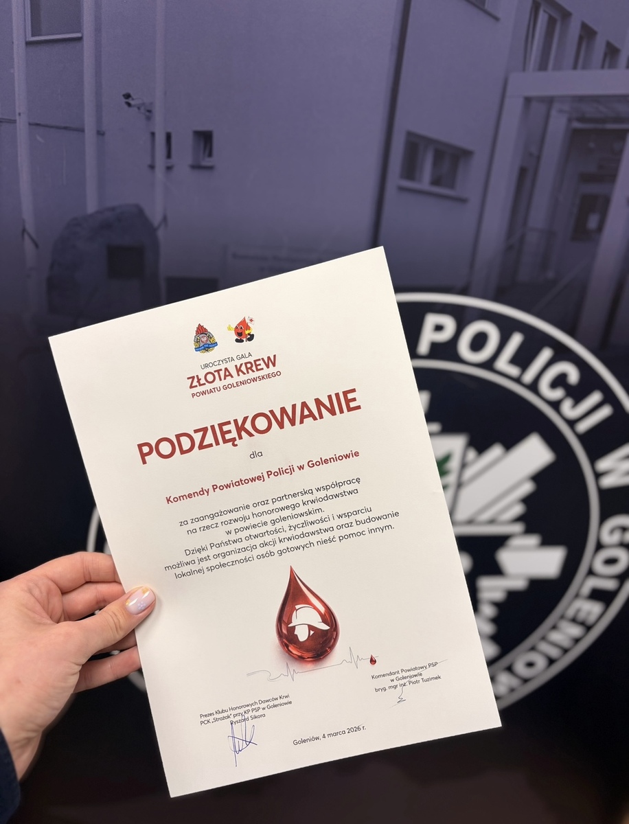 Wczoraj w Komendzie Powiatowej Państwowej Straży Pożarnej w Goleniowie odbyła się uroczysta gala „ZŁOTA KREW”, będąca podsumowaniem działań na rzecz honorowego krwiodawstwa w minionym roku. W wydarzeniu uczestniczył p.o. Komendanta Powiatowego Policji w Goleniowie kom. Sławomir Smolarczyk, który miał zaszczyt wziąć udział w spotkaniu będącym wyrazem uznania dla wszystkich osób i instytucji zaangażowanych w niesienie pomocy drugiemu człowiekowi poprzez oddawanie krwi.